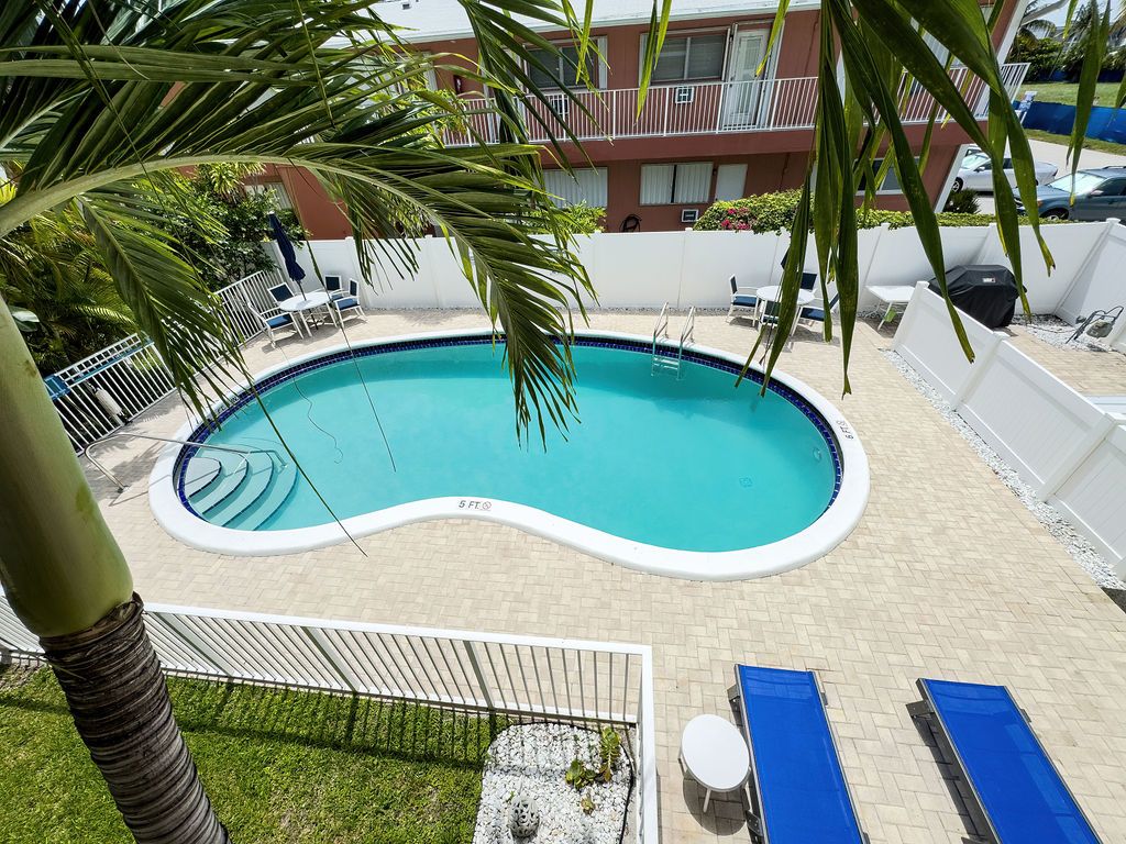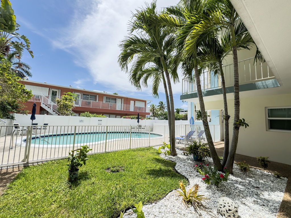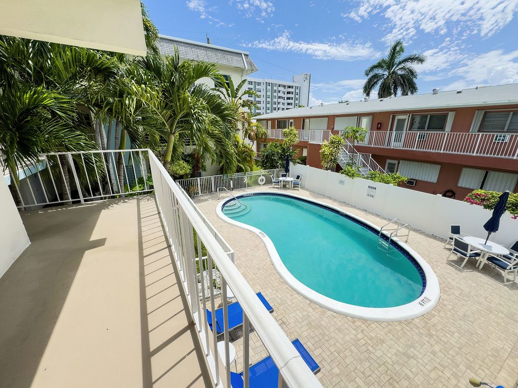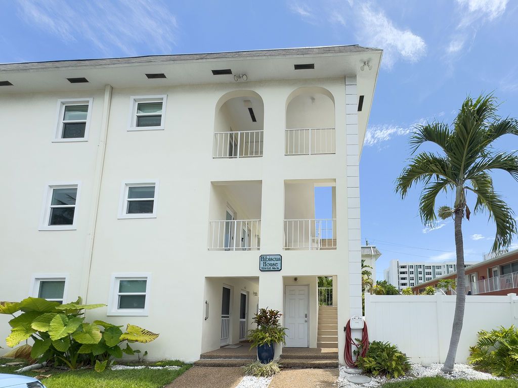 Welcome home to Hibiscus House, a 14 unit boutique residence in Pompano Beach's A1A corridor. Enjoy easterly views from your second floor screened patio and walk across Ocean Ave to the pristine beaches and Pompano Beach pier. This 1 bedroom, 1 bath condo has a newer A/C, and water heater, and accordion shutters for full hurricane protection. The building is pet-friendly.